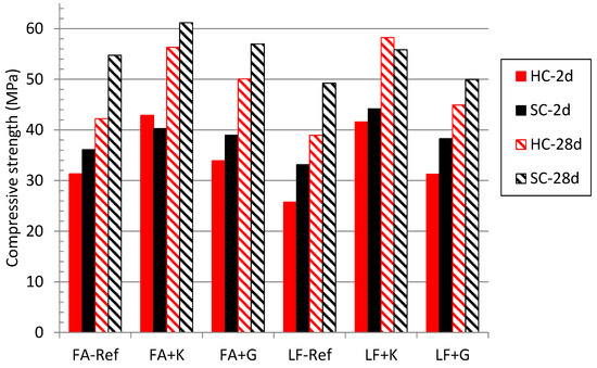The third and most important result obtained is the higher compressive strength value obtained in some cases in the expansive SCC with the type-K agent after heat curing with respect to the values obtained under standard curing. This phenomenon can be observed in Figure 2 and in Table 4, where the decrease (or increase) in compressive strength when using heat curing with respect to standard curing is shown. Table 4 defines the percentage loss or gain in compressive strength of each concrete mix after heat curing, compared to that shown after standard curing at the same age. While in almost all cases, as is usually the case in precast concretes subjected to heat curing, the compressive strength after heat curing is lower than after standard curing at the same age. There are two exceptions in the SCC with K-type expansive: after two days in SCC with FA and after 28 days in SCC with LF. In fact, it is very remarkable that the decrease in compressive strength detected in the SCC with the type-K agent, when it occurs, is very low compared to the one measured in the reference SCC. The decrease in this parameter is also lower than in the corresponding reference case when using expansive agent type-G; however, in this last case, the difference is lower than when the expansive type-K is used. Therefore, it is evident that the use of EAs, especially type-K, in precast concretes subjected to heat curing can limit or even eliminate the problem of loss of strength promoted by heat curing. According to the obtained results, the concrete composition influences the efficiency of the expansive agent with respect to the issue evaluated in this manuscript.