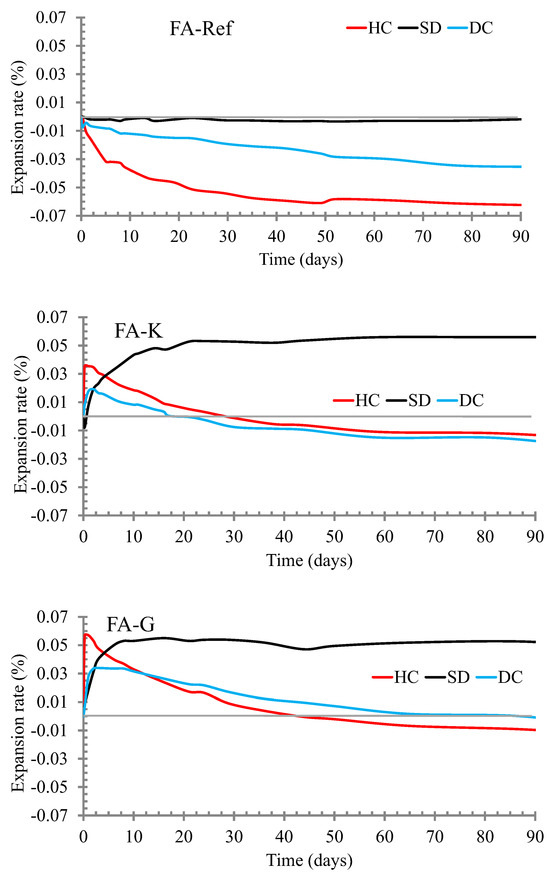 Expansive performance of the SCC with FA under the three different curing regimes considered. SC, standard curing; DC, dry curing; HC, heat curing.
