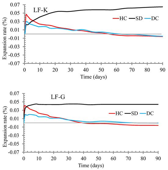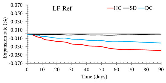 Expansive performance of the SCC with LF under the three different curing regimes considered. SC, standard curing; DC, dry curing; HC, heat curing.
