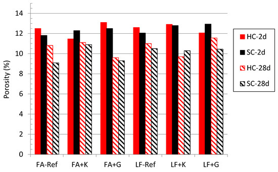 Figure 5 shows the total porosity (%) values of the fabricated concretes at different curing conditions and at different ages. Based on the results obtained, no major differences are observed between the total porosity values of the different concretes in each of the curing regimes considered. Moreover, there is no clear relationship between the total porosity values and the compressive strength values either. In fact, in some cases, the total porosity value is even lower in the reference concrete that had lower compressive strength than the expansive concretes (see Figure 4). However, it is possible to point out a phenomenon detected in some cases in expansive SCC with the type-K agent that does not occur in the reference SCC. In the samples with FA, after two days, the porosity is lower in the heat-cured concrete and higher in the standard-cured concrete. A similar phenomenon occurs for the SCC with limestone filler after 28 days of curing. In both cases, the compressive strength was higher in the accelerated-cured concrete, so it is evident that there must be some kind of relationship between these two parameters. Furthermore, this phenomenon never occurs neither in the reference SCC considered in this study nor in the results reported in previous publications [1,2,3,4,5,6,7,8,9,10]. Nevertheless, it is also true that, after two days, the concrete with limestone filler and expansive agent type-G also shows higher total porosity under standard curing than under heat curing, yet no higher compressive strength was observed in the heat-cured samples. Therefore, there must be other parameters involved.