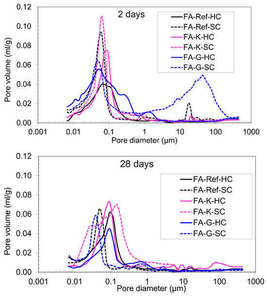 Pore size distribution of the SCC with FA at different ages and curing regimes. Up, 2 days; down, 28 days.
