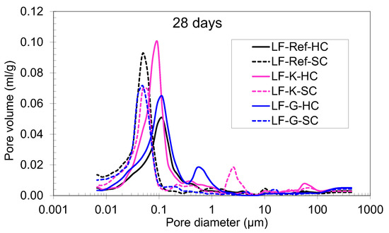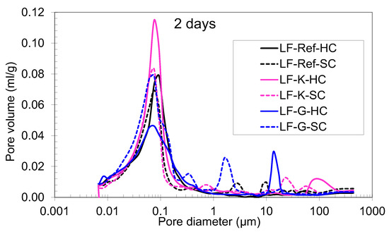 Pore size distribution of the SCC with LF at different ages and curing regimes. Up, 2 days; down, 28 days.