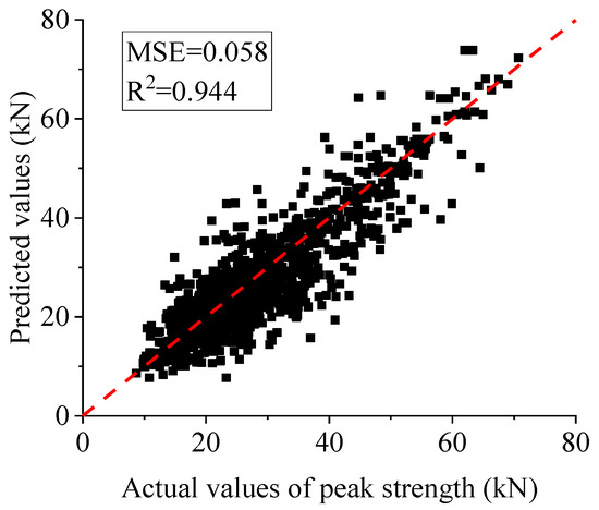 When applying the K-nearest neighbors (KNNs) method to predict the skeleton curves of seismically damaged RC columns, the predicted peak strength values are extracted and compared with the corresponding actual values, as shown in Figure 4. In the figure, the dashed line represents the 45-degree diagonal. The results demonstrate that the KNN method achieves excellent prediction performance for peak strength, with a mean squared error (MSE) of 0.022 and a coefficient of determination (R2) of 0.978. Furthermore, most of the data points are clustered around the dashed line, indicating a strong agreement between the actual and predicted values, as well as a positive correlation between them.