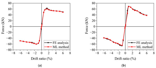 A comparison of the damaged skeleton curves predicted by K-nearest neighbors and those obtained from numerical analysis is shown in Figure 5. The results demonstrate that the K-nearest neighbors can accurately predict the skeleton curve of damaged columns, and the predicted skeleton curve aligns well with the analysis results from OpenSees. It highlights that, with sufficient sample data, the K-nearest neighbors method can produce highly satisfactory prediction results.