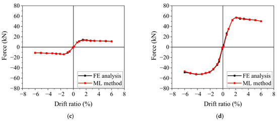 The damaged skeleton curves predicted by the K-nearest neighbors (KNNs) method are compared with those obtained from numerical analysis, as shown in Figure 5. The comparison demonstrates that the KNN method provides accurate predictions, with the predicted skeleton curves closely matching the results from OpenSees. It indicates that, given sufficient sample data, the KNN method is capable of delivering reliable and satisfactory prediction results.