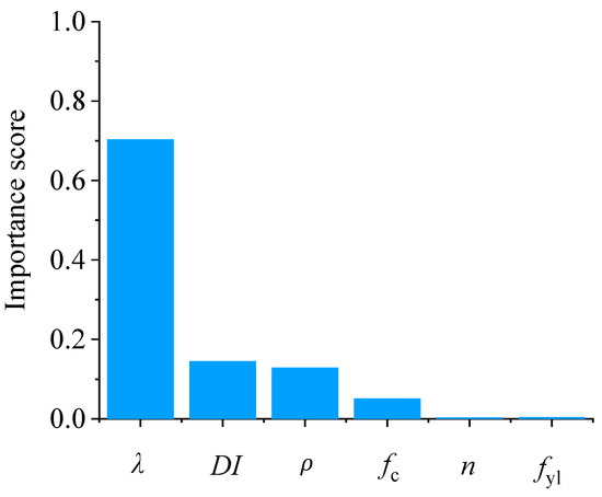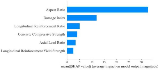 As seen in Figure 6, the importance ranking of the input features is as follows: aspect ratio, damage index, longitudinal reinforcement ratio, concrete compressive strength, yield strength of longitudinal reinforcement, and axial load ratio. The aspect ratio is the most significant factor affecting the output results, exerting a much greater influence than the other variables. The reason for these results is that the aspect ratio governs the size of the column section, and the column cross-section plays a dominant role in the column’s lateral resistance. The damage index ranks second, as expected, since the column’s bearing capacity is highly sensitive to its level of damage.