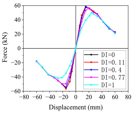 To further enhance the engineering utility and practical value of the machine learning approach, this study employs the validated KNN model as a representative example to systematically investigate the effects of damage progression on seismic behavior. Quantitative analysis of degradation degree aims to provide comprehensive insights into how skeleton curves evolve across different damage states and to generate practical engineering tools for post-earthquake assessment. Additionally, the skeleton curves at different damage levels were explored and compared to establish a comprehensive understanding of damage-induced behavioral changes. Figure 8 presents the comparison of skeleton curves across various damage levels. Taking an example with aspect ratio λ = 3, ρl = 1.55%, fc = 26.8, fyl = 400, and n = 0.2, the damage index (DI) varies from 0 to 1. The colored lines in the figure represent skeleton curves corresponding to DIs of 0, 0.11, 0.4, 0.77, and 1.0, which, respectively, correspond to intact, minor damage, moderate damage, severe damage, and collapse states. The key points shown in the figure include the zero point, yield point, peak point, and ultimate point.