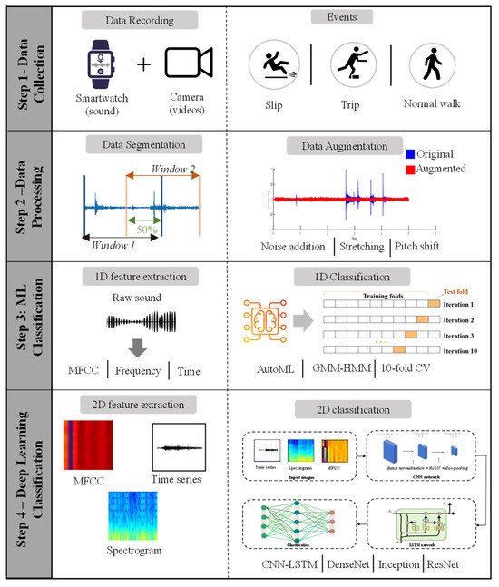 Figure 1 shows the overall process for sound-based slip and trip classification. The process consists of four key steps: (1) data collection, (2) data processing, (3) machine learning classification, and (4) deep learning classification. In Step 1, slip and trip events were simulated, and the corresponding sounds were recorded using a smartwatch. In Step 2, the recorded data were labeled into 3 categories: normal walking, slips, and trips. Data augmentation processes were then applied to expand the dataset and increase feature diversity. In Step 3, relevant time-series features were extracted from the recorded sound signals, and machine learning models were trained. In Step 4, 2D image features were extracted from the audio data and used to train various deep learning models.