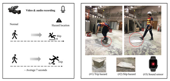 Slips and trips are common near-miss events on construction sites, which often trigger or precede severe fall accidents and injuries [1]. Despite the regular occurrence of these incidents, they are among the most unreported and undetected events on construction sites [2]. Studies suggest that approximately 20% of dangerous accidents, such as falls on construction sites, are triggered by near-miss incidents such as slips and trips [3,4]. However, research has reported that many slip and trip incidents go unreported due to factors such as worker reluctance, lack of systematic reporting systems, and low management priority, particularly since near-miss events often leave no tangible evidence unless they result in injury [5,6]. This substantial underreporting limits the accurate assessment and prevention of these hazardous events, making it challenging to address their root causes and prevent recurrence [7]. Effective detection of these incidents is important since it presents an opportunity to identify constantly vulnerable workers, hazardous areas on site, and other risk factors that trigger these incidents.