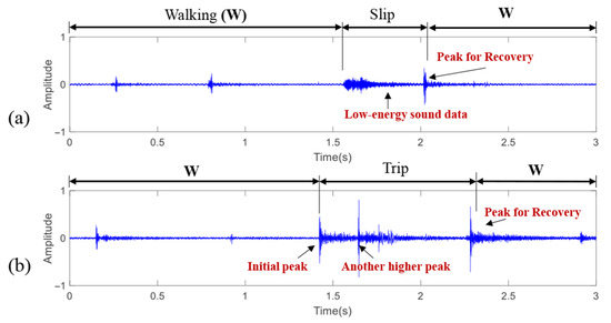Labeled sound sensor data in the time domain: (a) slip; (b) trip.