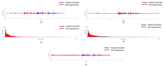 Data augmentation techniques: (a) quickly stretching the time, (b) slowly stretching the time, (c) positive pitch shift, (d) negative pitch shift, (e) white noise.