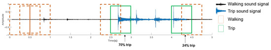 Table 1 shows the total number of window segments obtained from the collected 1500 recorded audio clips with varying window sizes. It can be identified that as the window size doubles, the corresponding number of window segments decreases by around half. After data segmentation, each window segment was assigned one of three labels (normal, slip, trip). If the area covered by the window encompassed over 50% of either ‘slip’ or ‘trip,’ the window segment was labeled as either ‘slip’ or ‘trip.’ All other window segments were labeled as ‘walking’. Figure 5 illustrates an example of data labeling for window segments. The ‘walking’ sound signal is highlighted in a dashed orange box, while slip or trip events are highlighted in solid green boxes. The left window segment highlighted in green is labeled as a ‘trip’ behavior since 70% of its area corresponds to the trip signal. Conversely, the dashed orange window segment located on the right side is labeled as ‘walking’ because only 24% of the trip sound signal falls within that window.