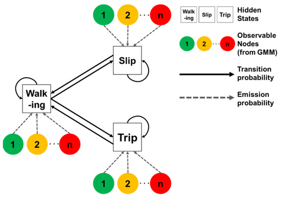 In addition to the 15 AutoML models, a custom GMM-HMM model was also trained. Despite being old, this model has demonstrated strong robustness in sound-based classification in previous studies. Figure 6 shows a schematic layout of the GMM-HMM. The HMM is designed to predict hidden states based on the sequences of prior hidden states and observable features by computing transition and emission probabilities [70]. In this study, the hidden states correspond to the behavior labels—walking, slips, and trips—while the observable nodes are derived from extracted sound signal characteristics modeled using the GMM. The use of GMM presents some advantages since it prevents the performance reduction that can occur when directly using time-series features [71].
