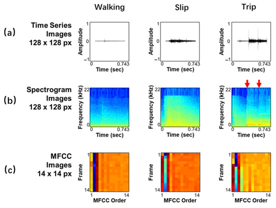 Image features extracted from the sound data: (a) time series; (b) spectrograms; (c) MFCC.
