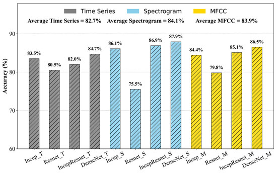 Table 7 shows the performance of pre-trained models using various image features across different window sizes. Two key findings emerge from the results. First, shorter window sizes (0.046 s and 0.093 s) generally resulted in higher classification accuracies across most models, whereas longer window sizes (0.372 s and 0.743 s) led to performance declines. This trend is particularly evident in the ResNet50 model with MFCC features, where accuracy dropped significantly from 0.851 in the 0.046 s window to 0.719 in the 0.743 s window, a decrease of over 13%. Similarly, the InceptionV3 model with time-series images gradually declined in performance, decreasing from 0.844 to 0.821. Similar performance reductions were observed in ResNet50 and InceptionV3 when trained with MFCC features. These findings suggest that larger window sizes may introduce noise or redundant information, diminishing classification effectiveness. Second, while most models exhibited a decline in performance with increasing window size, certain models demonstrated high stability across different window sizes, indicating their robustness to window variations. For instance, the DenseNet169 model trained with time-series images exhibited the lowest standard deviation (0.002), maintaining nearly constant accuracy across all window sizes. Similarly, the DenseNet169 model with spectrogram images and the InceptionResNetV2 model trained with MFCC features showed minimal accuracy fluctuations, suggesting that these models effectively manage variations in window size without significant performance degradation.