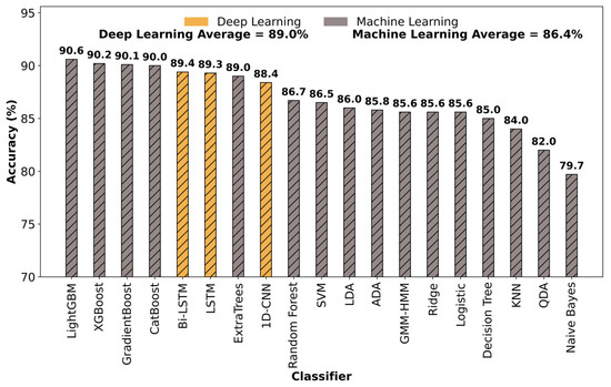 Table 4 presents the test performance of machine learning classifiers across varying window sizes. The table shows three key findings. First, although the GMM-HMM model achieved the highest accuracy of 0.918 in the smallest window, its average accuracy across the five window sizes was 0.856. This suggests that while the GMM-HMM model is highly effective in smaller window sizes, its performance declines significantly with increasing window sizes. According to Dahl et al. [85], although GMM-HMM models can initially achieve competitive performance, they are susceptible to performance degradation when large or suboptimal window sizes are selected. Second, tree-based and boosting algorithms such as CatBoost, LightGBM, and gradient-boosting machines performed better than traditional classifiers such as decision trees and Random Forests. Notably, CatBoost and LightGBM both achieved an accuracy of 0.907 in the smallest window. This finding aligns with previous studies, where these algorithms have consistently outperformed conventional machine learning classifiers [86]. Gradient-boosting models, such as CatBoost, incorporate mechanisms such as inbuilt boosting enhancement, which help mitigate data bias and variance and lead to superior performance [87].