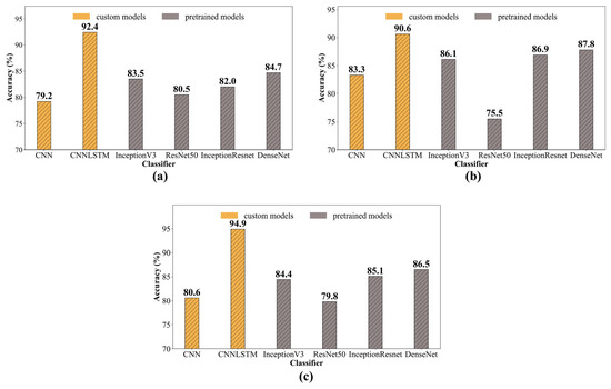 In addition to the custom-trained CNN and CNN-LSTM, four pre-trained networks, which include InceptionV3, ResNet50, InceptionResNetV2, and DenseNet169 [80,81,82], were also tested using a transfer learning approach. This was done to evaluate their performance in sound classification and to serve as base comparison models for the custom-trained CNN and hybrid CNN-LSTM models in this study.