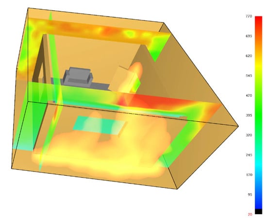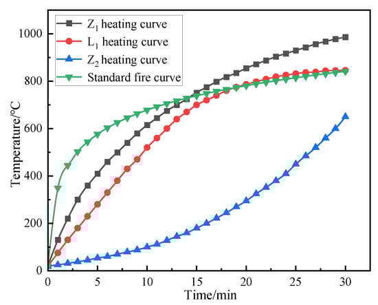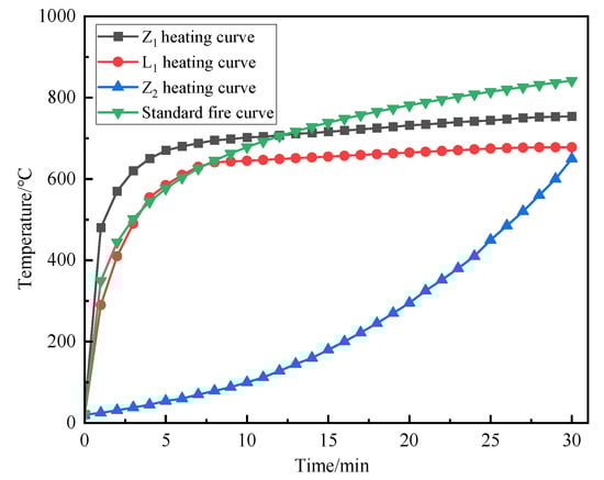 4 are surrounded by other structures, and the ventilation conditions are insufficient. The heat is difficult to dissipate through heat convection and mainly depends on heat conduction. However, due to the high ambient temperature, the heat dissipation efficiency is low, resulting in a lower temperature. This significant non-uniformity of the temperature distribution produces a serious thermal gradient, and the measured temperature difference between the columns is as high as 485 °C. The measured temperature difference between the beam components is as high as 220 °C. The external components (Z