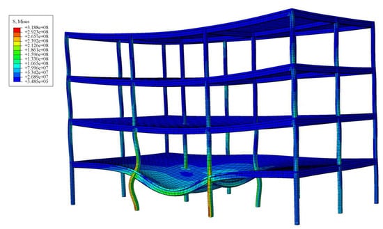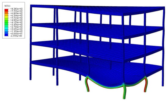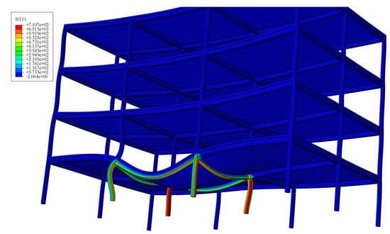 Figure 11, the original axial force of column 1 is 1100 KN, the axial force after failure is 0, and the new axial force of adjacent columns is as follows: the axial force increment (peak-initial value) of column 2 after the fire is 650 KN, the axial force migration ratio is 59%, and column 2 shares 59% of the original load of failure column 1; the axial force increment of column 3 after the fire is 750 KN, the axial force migration ratio is 68.2%, and column 3 shares 68.2% of the original load of failure column 1; the axial force increment of column 4 after the fire is 260 KN, the axial force migration ratio is 23.6%, and column 4 shares 23.6% of the original load of failure column 1. Because the load redistribution of column 4 is less, column 4 is not damaged. The path of load redistribution is mainly manifested as the load redistribution of adjacent members—column 2, column 3, and column 4—after the failure of column 1. It shows that the adjacent columns are significantly overloaded, which verifies the intensity of load redistribution under the redundancy mechanism. Finally, the local instability triggers the chain collapse of the whole structure, which is manifested as the collapse failure without obvious plastic deformation.
