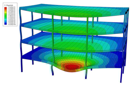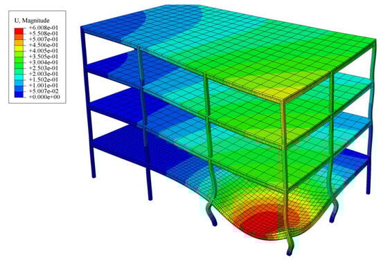 4) is kept below 300 °C due to the avoidance of direct cooling and heating effects, thereby maintaining its structural integrity and carrying capacity at room temperature. This imbalance greatly changes the force transmission path of the structure and accelerates the collapse mechanism. The overall displacement diagram of the steel frame with a fire-damaged side-span is shown in