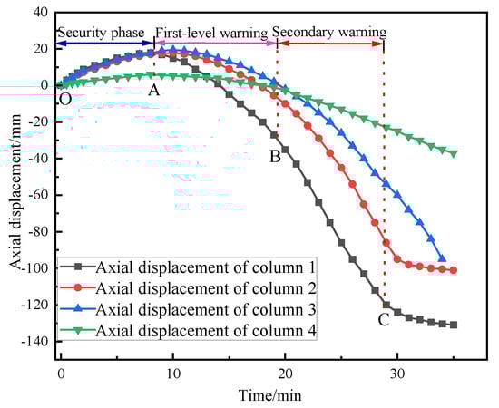 The displacement is positive upwards and negative downwards. The axial displacement of different fire columns is shown in