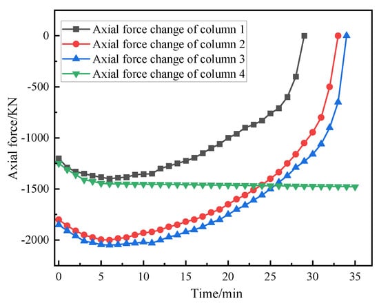 4 was 5.6 mm/min, which did not reach the limit value and still had a certain bearing capacity. The axial force changes of different fire columns are shown in