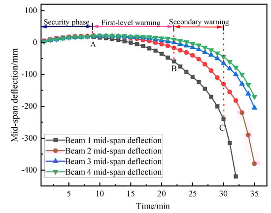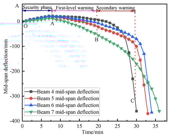 Through the analysis of the data in the figure, it can be concluded that the beam is basically consistent in the thermal expansion stage, and early warning point A is the end stage of thermal expansion; warning point B is that the deflection value of the beam is greater than 100 mm or the deflection rate of the beam is greater than 30 mm/min, and the secondary collapse warning is issued; warning point C is that the deflection of the beam is greater than 300 mm or the deflection rate of the beam exceeds 87.2 mm/min, and a three-level warning is issued. L