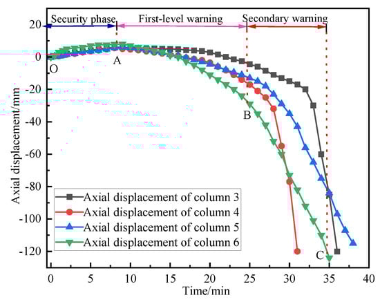 4. A, B and C represent the critical points of three-level early warning respectively. Warning point A marks the end stage of thermal expansion. At the initial stage of the fire, the axial deformation rate of each column is maintained at about 1.5 mm/min. At warning point B, the axial deformation rates of Z