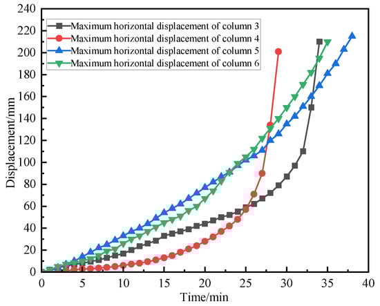 6 columns is relatively flat. During the whole fire process, the displacement–time curve of the two columns showed a relatively stable growth trend. When the fire lasts for about 35 min, the displacement value approaches the limit state. This response characteristic presents a typical ductile failure mode, which shows that the component undergoes a significant plastic deformation stage before reaching the ultimate displacement, reflecting its good energy dissipation capacity and continuous deformation capacity under high temperature. The fire resistance limits of different fire columns are shown in