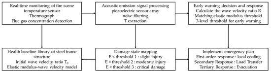 It can be seen from the diagram that the expansion of the column under the condition of mid-span fire is reduced. First-order warning point A marks the end of the free thermal expansion stage and represents the maximum expansion point with a net deformation rate of zero. Subsequently, the development of the binding force begins to dominate. At the initial stage of the fire, due to uniform heating and expansion, the axial deformation rate of each column is generally maintained at about 1 mm/min. At secondary warning point B, the axial deformation rates of Z3, Z4, Z5, and Z6 are 5 mm/min, 5.8 mm/min, 5.6 mm/min, and 6 mm/min, respectively. The critical limit value and the limit rate defined for structural collapse have not yet been reached. This stage marks the transition from pure thermal expansion to significant compressive stress development. As the columns expand axially, they are increasingly constrained by the colder, more rigid parts of the surrounding structure. This constraint converts thermal expansion into compressive stress in the heating column. The transition to the local damage warning level at point C is characterized by significant differentiation of behavior. The deformation rate of the Z3 and Z4 columns increased sharply to 32 mm/min and 38 mm/min, respectively, indicating that they completely lost their bearing capacity. The physical mechanism of this rapid failure is a chain reaction triggered by stress concentration and thermal softening. The bottom areas of Z3 and Z4 are identified as high-stress concentration areas. With the increase in temperature, the yield strength and elastic modulus of steel deteriorate significantly. The initially developed compressive stress eventually exceeds the yield strength of the material due to the high temperature, causing local plastic yield. This yield leads to a catastrophic loss of stiffness in the affected area, effectively forming a plastic hinge. The structure then undergoes rapid stress redistribution, transferring the additional load to the already-damaged section. This process accelerates the plastic flow, resulting in an exponential increase in the observed displacement rate without significant additional plastic deformation, which is a sign of quasi-brittle failure at high temperatures. The decrease in material ductility and the lack of rotational capacity at the support in the high-temperature environment further aggravate this process, prevent the ductility behavior, and lead to sudden failure. In contrast, the deformation rates at warning point C of Z5 and Z6 are 13.4 mm/min and 12.6 mm/min, respectively. It is because these columns are less constrained or the temperature is slightly lower, delaying the triggering of the same failure mechanism.