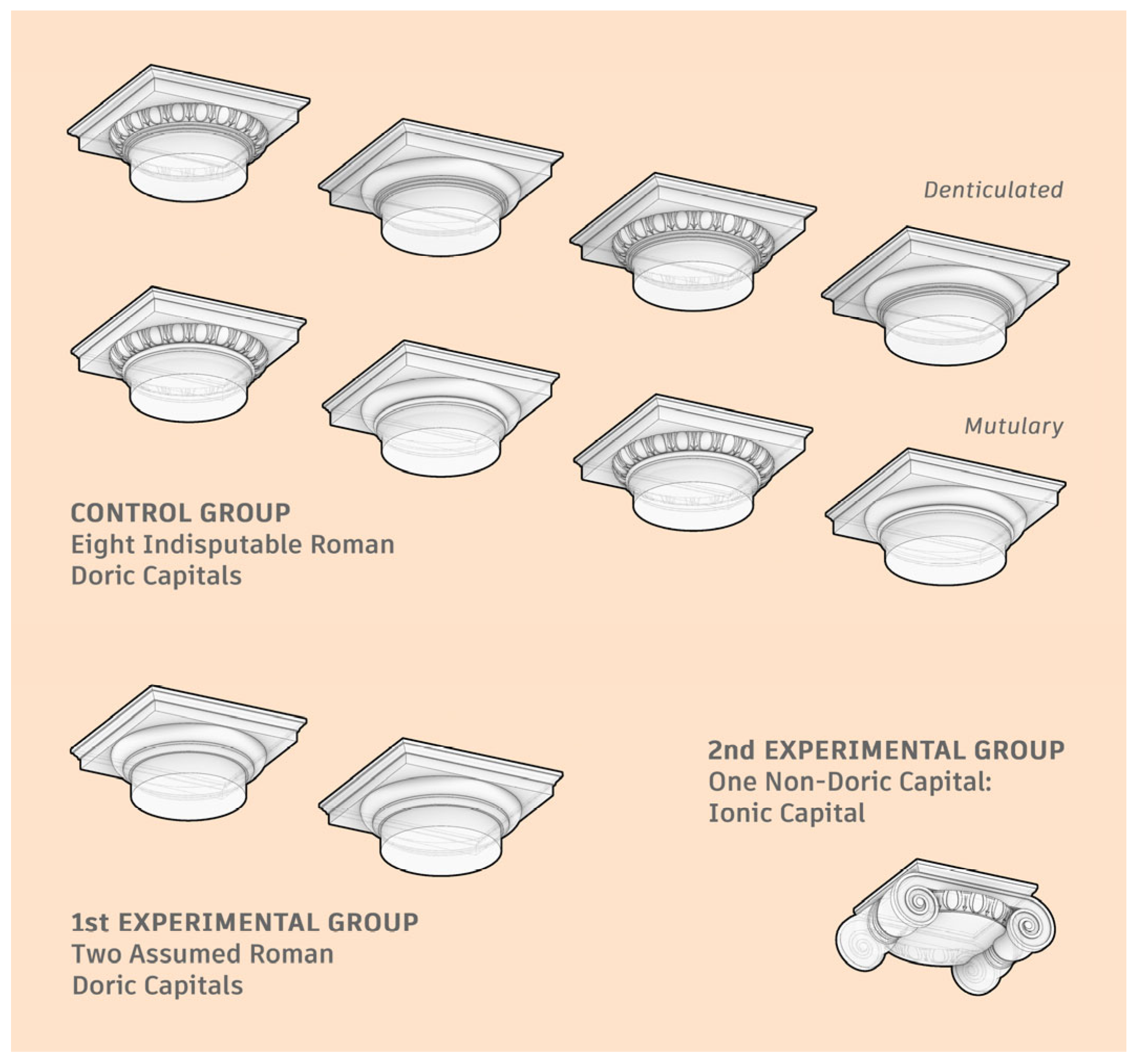 Control Group | To Establish a Reference Entity and “Constant” Probability Bounds and To Provide Expected Results of the Stylistic Assessment | Capital 1 | Doric | Roman | Denticulated | Indisputable | IRD(1) | ✓ |