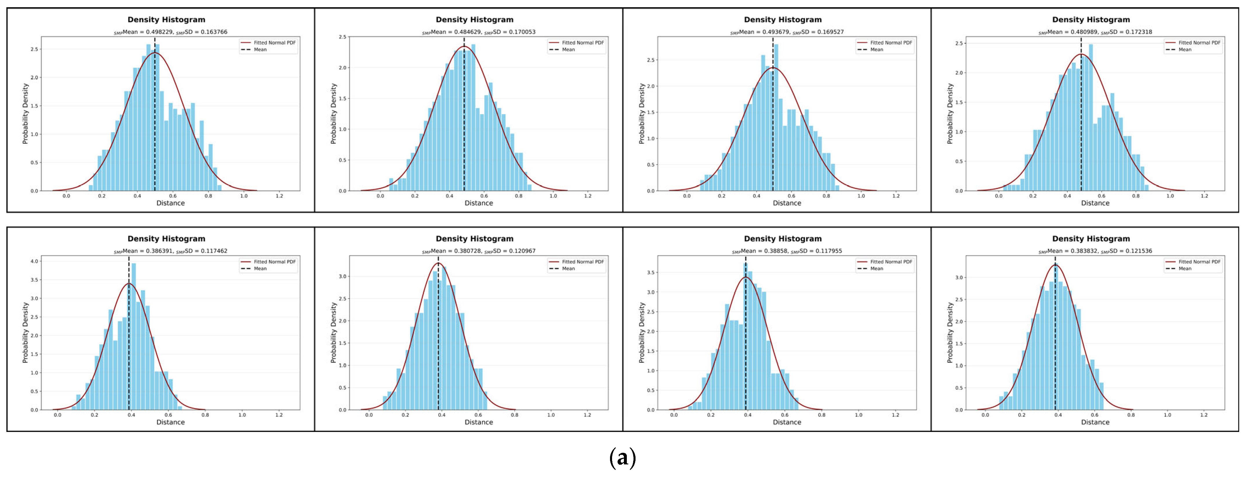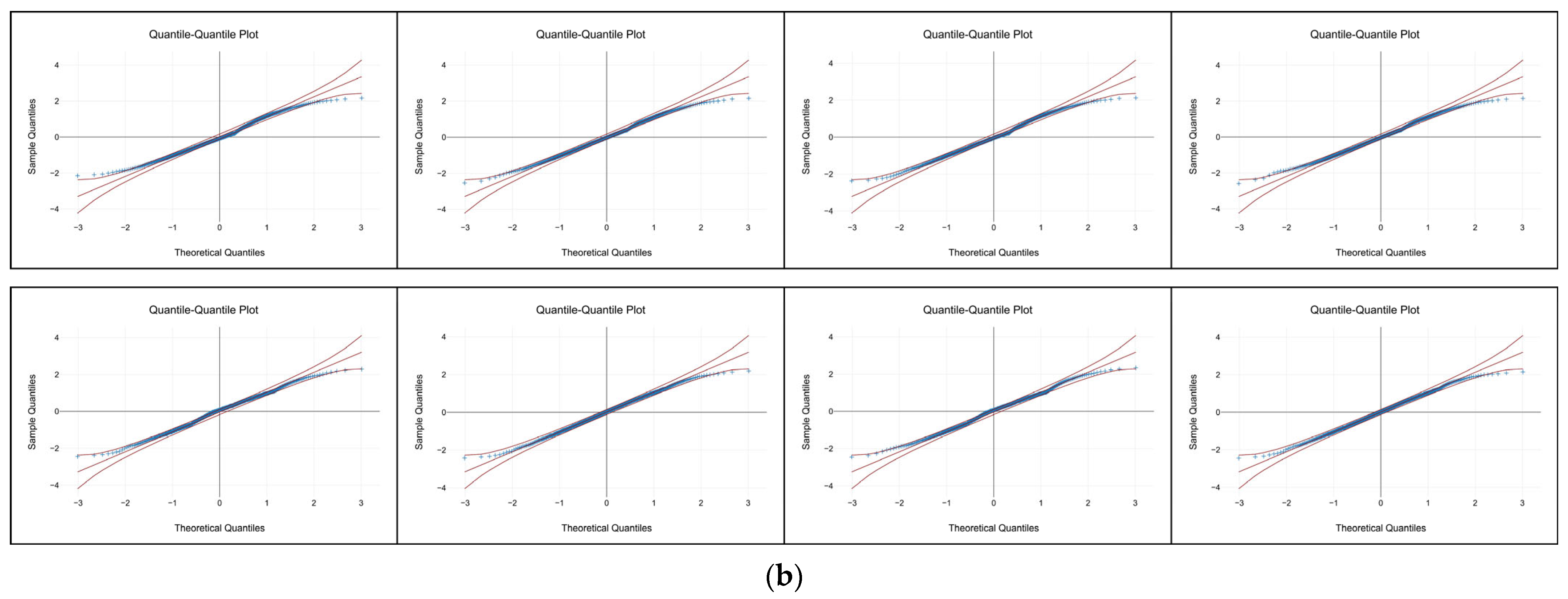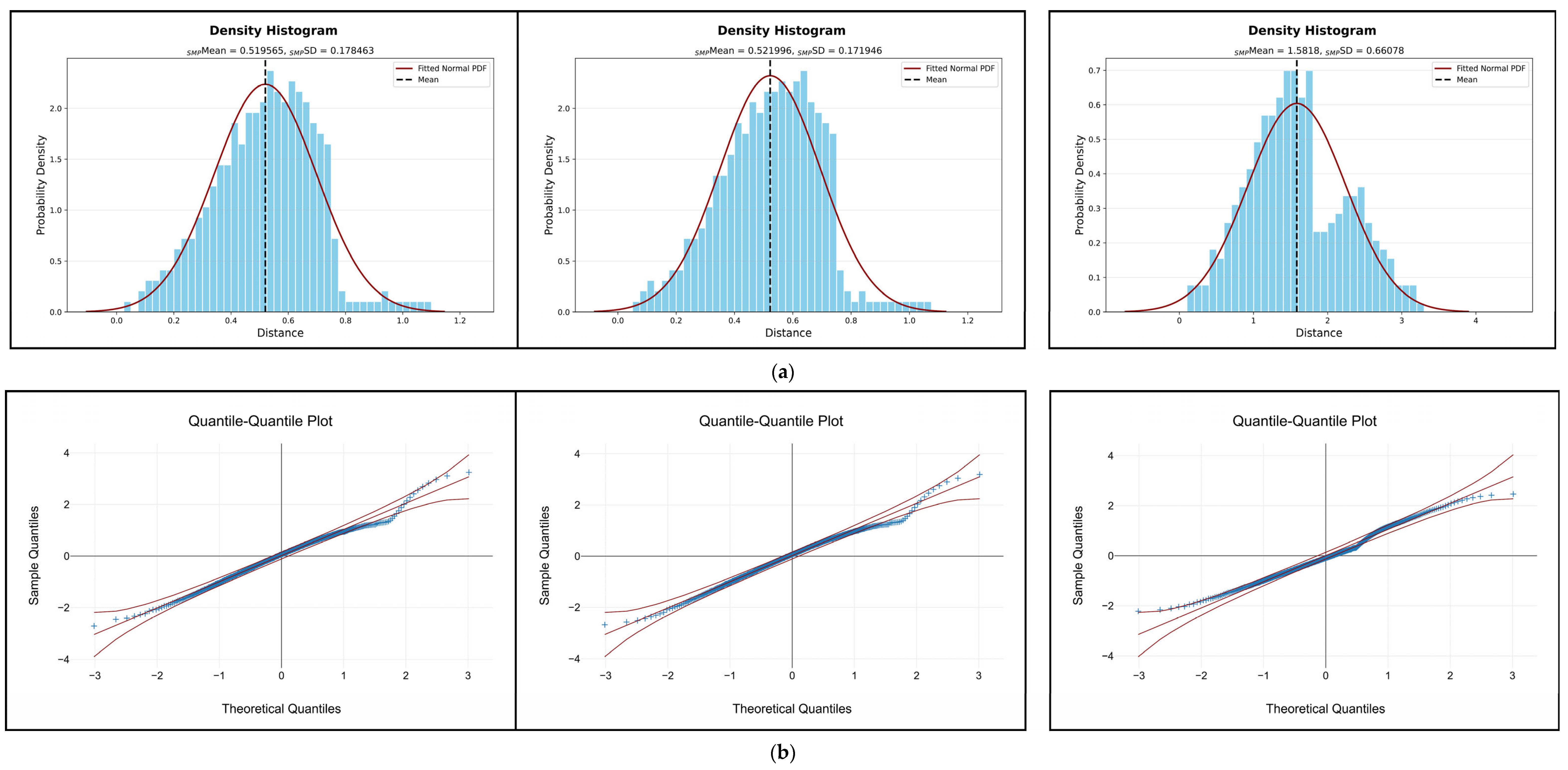 - Statisty freeware, available online at https://statisty.app/ (accessed on 25 July 2025), for creating relevant normal quantile–quantile (hereinafter referred to as Q–Q) plots in the role of indicators of normality of SMP-related distance distributions (Section 3.1.3);