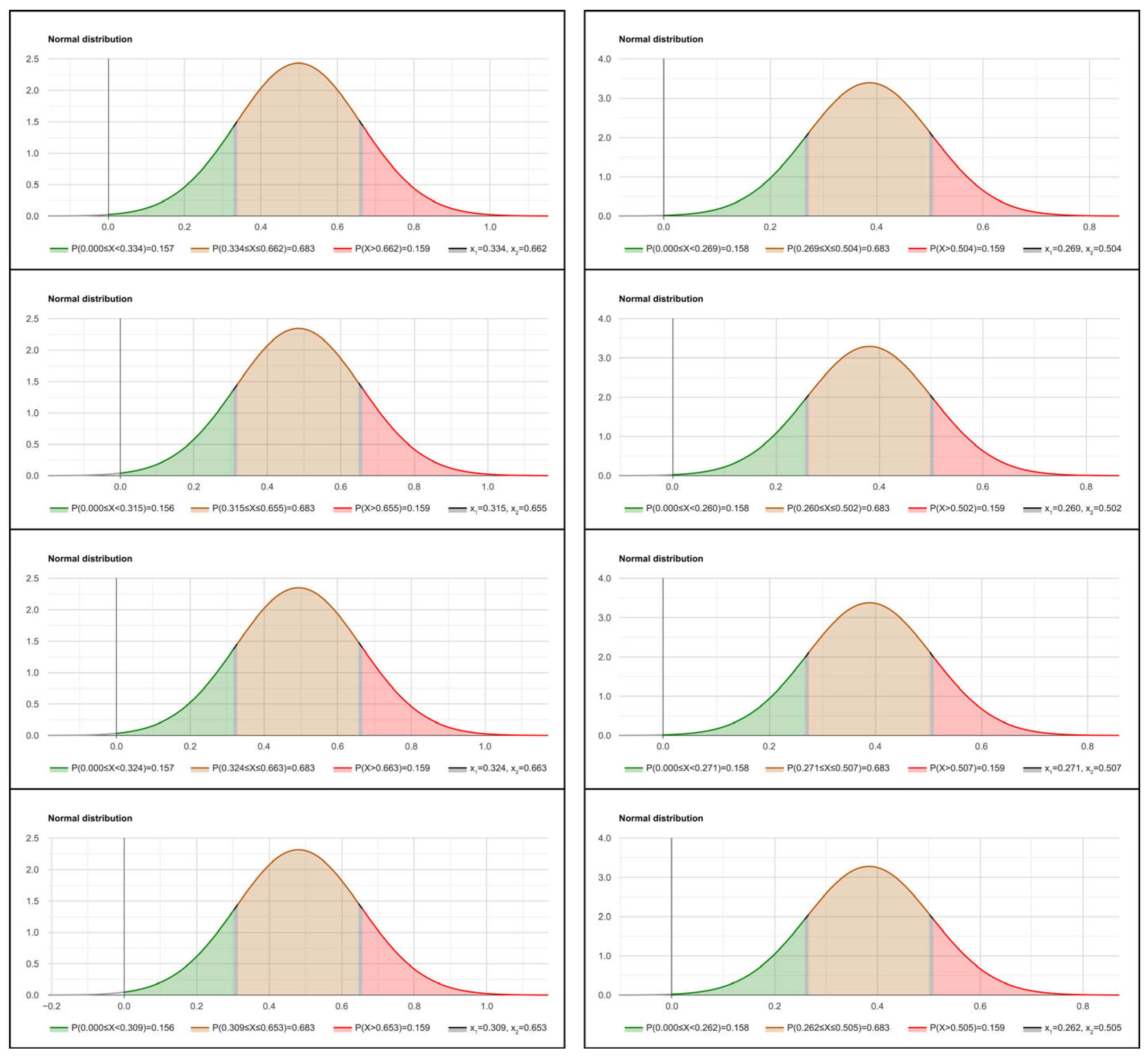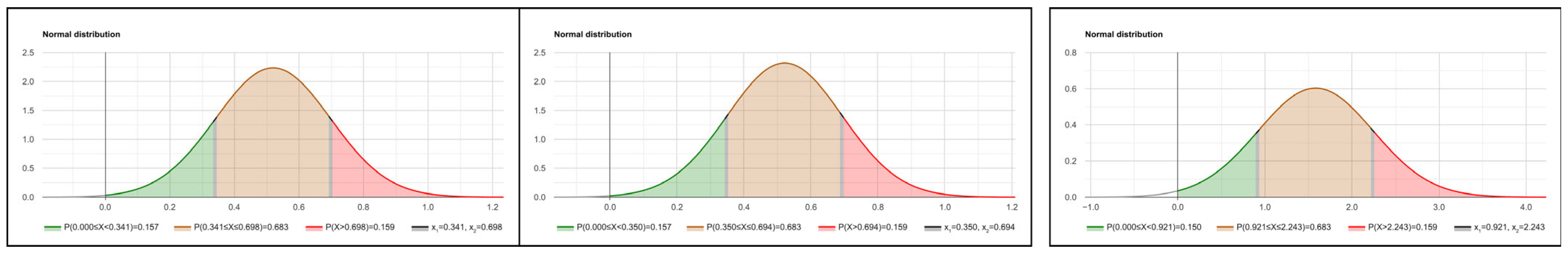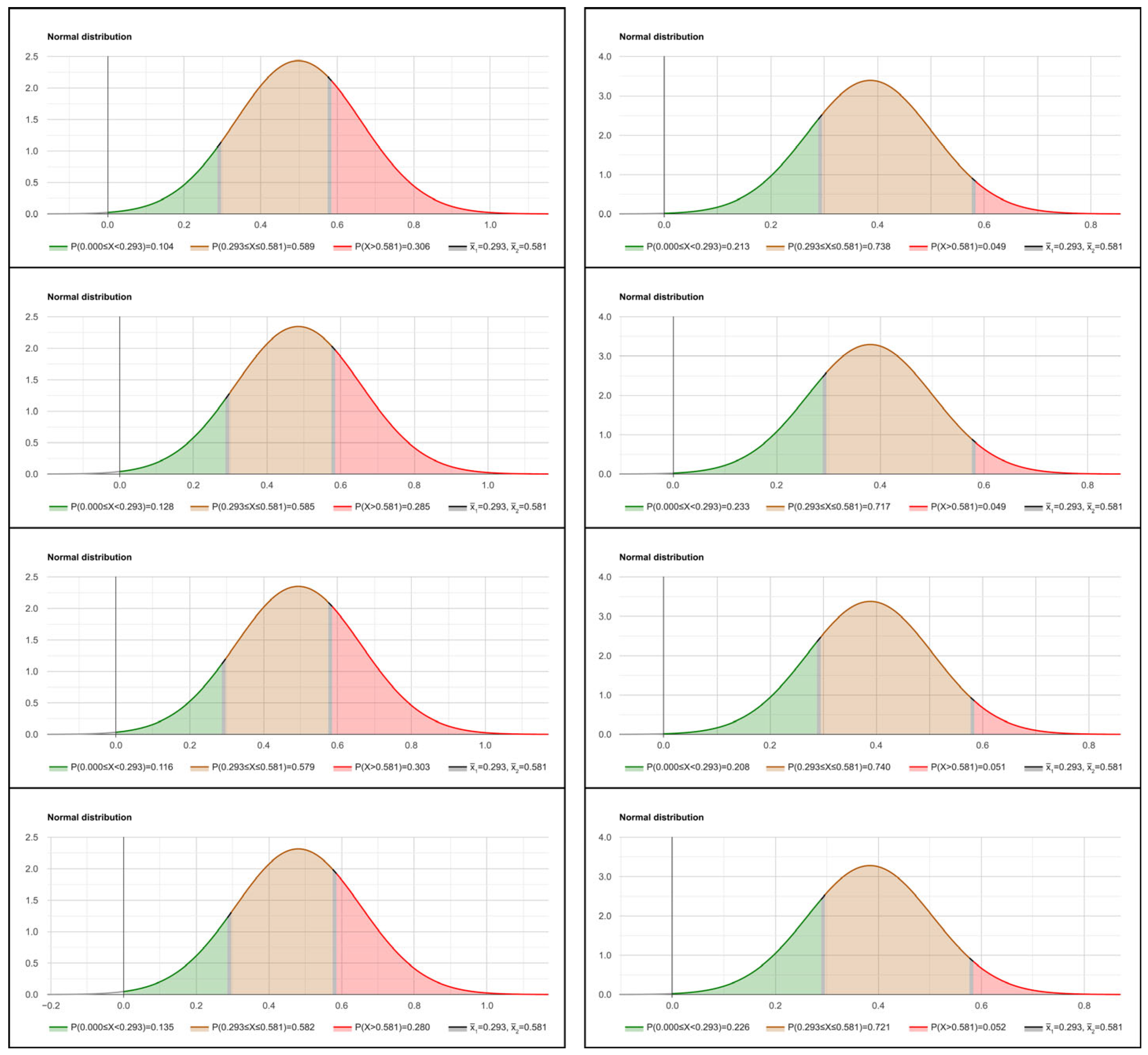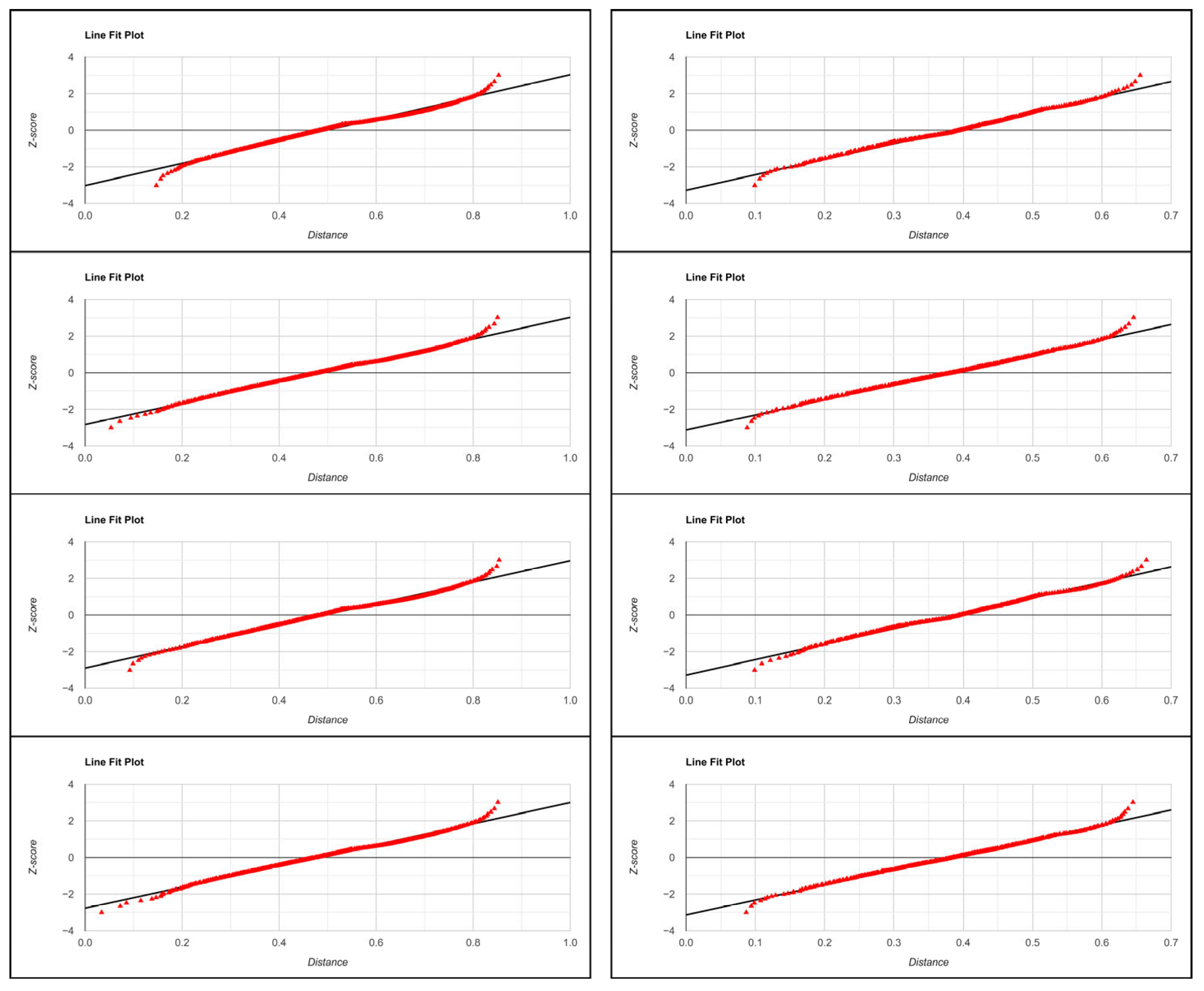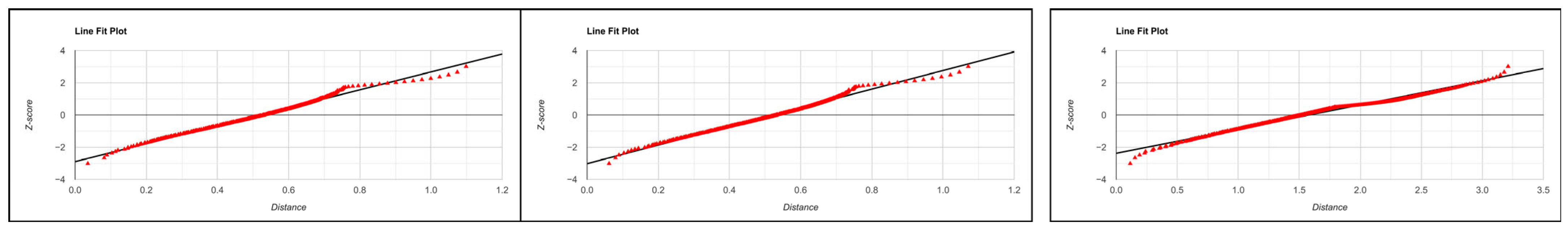- Numerical—by considering how close the values of the coefficient of determination (hereinafter referred to as r2), calculated based on the line fit plots created, are to their targeted values, namely, by indicating how large the portions of the variances in the dependent variable (SMP-related normal/theoretical z-scores) are such that can be explained by the independent variable (SMP-related distances)—in accordance with the principle that the higher the value of r2 (in the range between 0 and 1) is, or in other words, the better the SLR model fits the data, the more strongly correlated the variables are to each other and the data, consequently, more normally distributed.