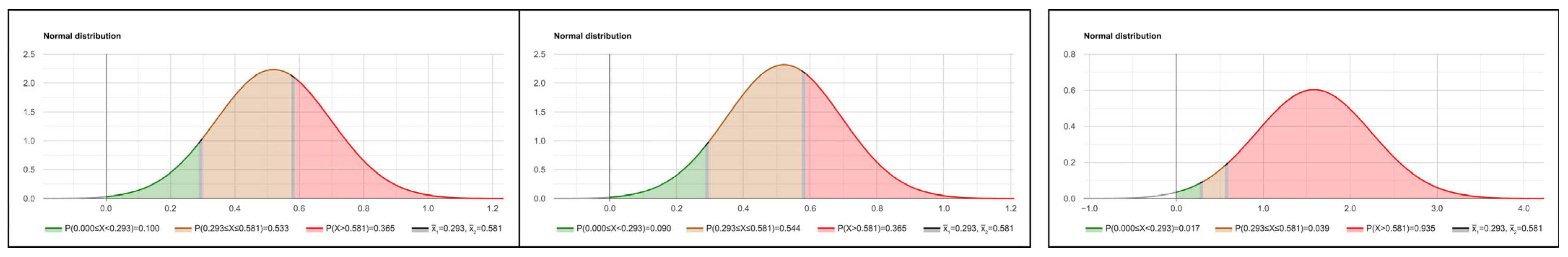 - Statistics Kingdom (launched in November 2017) as a freeware available online at https://www.statskingdom.com/ (accessed on 25 July 2025), for applying simple linear regression (hereinafter referred to as SLR) models in the role of estimators of the amount of correlation between SMP-related distances and their corresponding normal/theoretical z-scores (Section 3.1.3), as well as for defining normal PDFs of distributions of such distances and calculating relevant areas under, equal to aim-directed probabilities (Section 3.1.4).