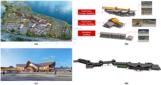 Schematic diagram of Liangzi Lake service area: (a) aerial view; (b) structural model; (c) perspective view of the complex building; and (d) site model.
