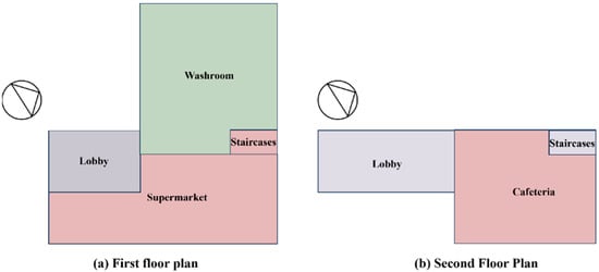 The architectural model of the North Complex is shown in Figure 2. The total building area is 1554 m2, with 963 m2 designated as air-conditioned spaces. The zoning of the various functional areas of the North Complex is shown schematically in Figure 3. The building consists of two levels, with the ground floor accommodating a lobby, supermarket, restrooms, and storage facilities. The second floor houses a dining area. This functional zoning supports diverse service demands, enhancing operational efficiency and user experience.