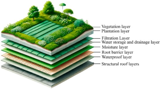 Among the various forms of green infrastructure, green roofs have attracted substantial attention due to their multifunctional benefits. These systems consist of layered assemblies that support plant growth on building rooftops, thereby providing thermal insulation, enhancing evapotranspiration, and improving overall building energy performance [,,,]. As the roof surface accounts for a significant portion of heat exchange in buildings, green roofs offer a practical solution for reducing indoor temperature fluctuations and Heating, Ventilation, and Air Conditioning (HVAC) energy loads. For instance, vertical and rooftop greening systems have been shown to lower indoor temperatures by up to 2.1 °C, reduce peak wall surface temperatures, and achieve annual energy savings of up to 8.9% in some cases [,,]. Additionally, green roofs contribute to stormwater management, biodiversity conservation, and urban esthetics [,,].