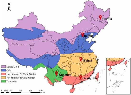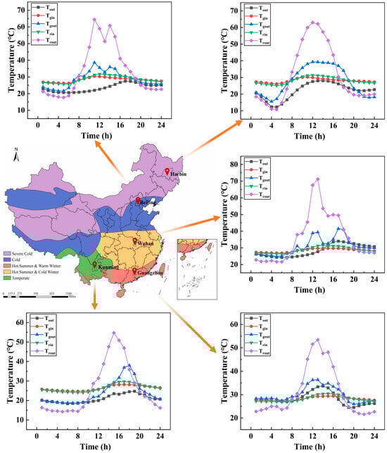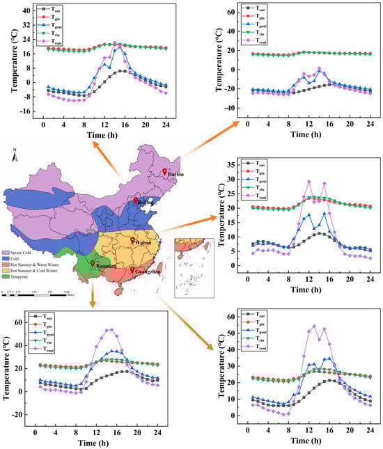 Climate Input: Weather data were obtained from the EnergyPlus official database (https://energyplus.net/weather, accessed on 30 September 2024), using China Standard Weather Data (CSWD) files. These datasets include 8760 h of detailed information on air temperature, solar radiation, humidity, wind speed, precipitation, and cloud cover, etc. CSWD files were applied for Harbin, Beijing, Wuhan, Guangzhou, and Kunming, each representing a distinct climate zone.