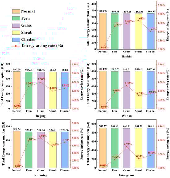 The analysis in Figure 6 indicates that the implementation of green roofs on buildings in different regions of China has a notable impact on reducing annual energy consumption. The highest energy savings were achieved by grass green roofs in Beijing, Wuhan, Guangzhou, and Kunming, with 1.5%, 1.32%, 0.77%, and 2.02%, respectively. The energy efficiency of shrub green roofs was the highest in Harbin, with 1.64%, and that of grass green roofs was 1.49%. The type of green roof has a significant effect on energy-saving potential. The energy savings of shrub and grass roofs were generally better than those of other roofs. These findings suggest that the type of green roof is pivotal in determining energy-saving potential, and regional climate should be a critical factor in the selection process. The climate zone plays a significant role, as the thermal properties and insulation provided by green roofs can influence the building’s energy demand. Grasses, ferns, and shrubs have different growth habits, leaf areas, and transpiration rates, which can affect the roof’s ability to cool the building through evapotranspiration. The interaction between the green roof and the building’s HVAC system can also affect energy consumption. These factors collectively determine the effectiveness of green roofs in reducing a building’s energy consumption.