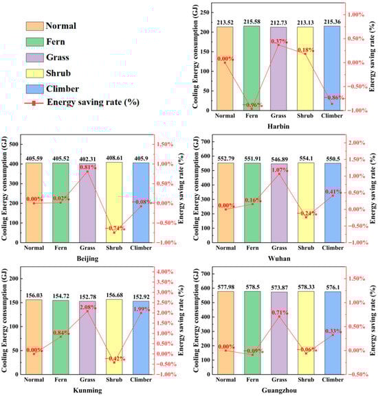 The effect of various green roof types on the cooling energy consumption of buildings in different climate zones in China is analyzed in detail in Figure 7. The energy consumption of green roof cooling in Beijing decreased slightly from 405.59 GJ to 402.31 GJ, with an energy saving rate of 0.81%. The energy consumption of green roof cooling in Harbin was reduced from 213.52 GJ to 212.73 GJ, with an energy saving rate of 0.37%. The energy consumption of grass green roof cooling in Wuhan was reduced from 552.79 GJ to 546.89 GJ, with an energy saving rate of 1.07%. The energy consumption of grass green roof cooling in Guangzhou was reduced from 577.98 GJ to 573.87 GJ, with an energy saving rate of 0.71%. The energy consumption for green roof cooling in Kunming was reduced from 156.03 GJ to 152.78 GJ. The energy saving rate was 2.08%. However, shrub roofs showed negative savings for the cooling energy consumption of buildings in areas other than Harbin. The impact of other plants on the cooling energy consumption of a building varies. The overall energy-saving rate is positive. These findings suggest that the implementation of green roofs can effectively reduce dependence on artificial cooling systems, thereby enhancing the sustainability of building operations. However, the cooling performance of green roofs varies significantly depending on the type of vegetation and the climatic context. Plant species differ in growth patterns, leaf area index, and transpiration capacity, all of which influence the roof’s ability to dissipate heat through evapotranspiration. Consequently, the selection of appropriate vegetation must consider regional climatic conditions to maximize cooling efficiency.