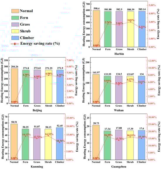 The effect of different types of green roofs on the heating energy consumption of buildings in different climate zones in China is analyzed in Figure 8. The energy consumption of shrub roof heating in Harbin decreased from 598.4 GJ to 580.39 GJ, with an energy saving rate of 3.01%. The energy consumption of shrub roof heating in Beijing was reduced from 284.26 GJ to 271.25 GJ, with an energy saving rate of 4.58%. The energy consumption of shrub roof heating in Wuhan was reduced from 141.97 GJ to 133.07 GJ, with an energy-saving rate of 6.27%. The energy consumption of fern roof heating in Guangzhou was reduced from 20.73 GJ to 17.34 GJ, with an energy saving rate of 16.35%. The energy consumption of shrub roof heating in Kunming was reduced from 58.51 GJ to 50.13 GJ, with an energy-saving rate of 14.32%. The various plants showed good heating and energy efficiency in all regions. The shrubs showed relatively better results. The high heating energy savings for all green roof types suggest that green roofs can significantly reduce reliance on artificial heating systems. The green roof provides an additional layer of insulation that reduces heat transfer from the building in winter. This was especially effective in colder climates, and the type of vegetation on a green roof affects its energy-saving potential.