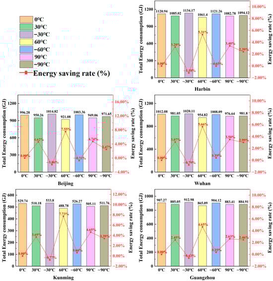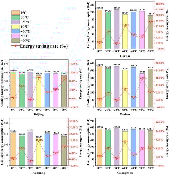The effect of building orientation on roof cooling energy consumption is shown in Figure 10. The cooling energy consumption of the building was reduced in all zones in the case of positive rotation. However, the angle of rotation at which the energy saving rate peaks is not the same. The buildings’ cooling energy consumption in the case of counter-rotation shows a decreasing trend as the angle is rotated, and the cooling energy saving rate increases step by step. The best refrigeration energy-saving angles in Harbin, Beijing, Wuhan, Guangzhou, and Kunming were −90°, 60°, 90°, 60°, and 60°, and the maximum energy-saving rate was 5.31%, 7.55%, 5.66%, 4.65%, and 7.73%. This was due to the different levels of shielding from solar radiation at different angles in different regions.