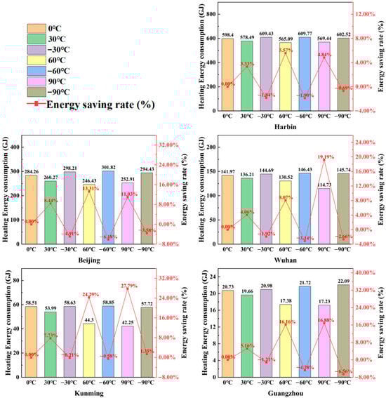 The effect of building orientation on roof heating energy consumption is shown in Figure 11. The heating energy consumption of the building was reduced in all regions under positive rotation. In cold places such as Harbin and Beijing, the best heating energy saving rate was achieved when rotating 60°, with 5.57% and 13.31%, respectively. However, in warm places such as Wuhan, Guangzhou and Kunming, the best heating energy saving rate was achieved when rotating 90°, with 19.19%, 16.88% and 27.79%, respectively, and the heating energy consumption increased in the case of reverse rotation, except for the case of rotating −90° in Kunming. This was since buildings receive different solar radiation in different areas with different orientations.