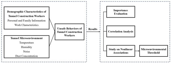 In light of this, this paper proposes a definition for “tunnel microenvironment”. The term refers to a set of pivotal environmental variables that have the potential to exert a substantial influence on the physiological state, psychological response, and behavioral patterns of construction personnel operating in closed, continuous, and high-intensity conditions. This definition encompasses conventional indicators, such as temperature, humidity, noise levels, and dust concentration. Based on this foundation, this study selects two representative cold-region tunnels in China as field cases. By deploying an environmental sensor network and a construction behavior tracking system, the research systematically collected multi-source environmental measurements and records of unsafe behaviors during construction. A nonlinear response model based on the random forest algorithm was then developed to identify the relative importance and nonlinear influence pathways of key microenvironmental variables. Furthermore, several targeted environmental control thresholds have been proposed to support the optimization of on-site safety management. The research framework is illustrated in Figure 1.