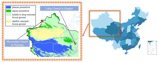 The permafrost distribution in China is characterized by significant geographical extensiveness and environmental diversity, given the extensive coverage of cold regions throughout the country. According to the most recent statistics, the area of permafrost in China (with the exception of glaciers and lakes) is approximately 1.59 million km2, which constitutes 16.6 percent of the country’s total land area. Specifically, high-latitude permafrost is primarily distributed in Northeast China, covering approximately 240,000 km2, while high-altitude permafrost is widely found on the Qinghai–Tibet Plateau and in the mountainous regions of Northwest China, with a total area of about 1.35 million km2. In addition, seasonally frozen ground covers an even larger area, approximately 5.36 million km2, accounting for 55.8% of the country’s land area. In recent years, as China’s national transportation infrastructure strategy continues to expand into western and remote regions, an increasing number of tunnel projects have traversed areas of permafrost and seasonally frozen ground, facing challenges posed by high altitudes, low temperatures, and intense freeze–thaw cycles under extreme climatic and geological conditions [,,,,]. This places greater demands on the design, construction, and maintenance technologies of tunnels. Furthermore, it is imperative that a more profound understanding of the characteristics of the cold-region permafrost environment be developed in order to enhance the safety and sustainability of the project.