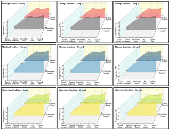 As shown in Figure 3, the analysis of 18 sets of measured data reveals that the temperature in the tunnel face area is consistently the highest. This reflects the combined effects of concentrated heat sources from construction machinery, limited local ventilation, and high work intensity. The temperature in the secondary lining construction area is also notably elevated, possibly due to the heat released from concrete hydration and the enclosed construction conditions. In contrast, the temperatures in areas such as the tunnel entrance, tunnel midpoint, and air outlet are significantly lower, being more influenced by external temperature and ventilation conditions. In terms of working condition comparison, the temperature distribution trends under the three typical operation conditions—drilling, mucking, and shotcreting—are generally consistent, with no significant differences observed between the conditions. Therefore, no separate distinction is made in subsequent analyses.