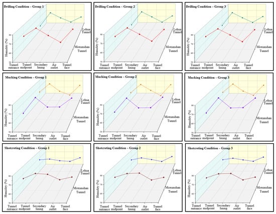 To comprehensively characterize the thermal and humidity variations within the tunnel workspace, this study conducted synchronous and continuous humidity measurements using the same SMART Sensor AR847+ handheld temperature and humidity detector (Shenzhen Smart Sensor Co., Ltd., Shenzhen, China) employed for temperature monitoring. The device has a humidity measurement range of 5.0% to 98.0% relative humidity (RH), with a resolution of 0.1%, and is capable of stable operation in high-humidity and high-dust environments. Humidity monitoring points were consistent with those for temperature, located at five positions: the tunnel face, air outlet, secondary lining, tunnel midpoint, and tunnel entrance. All sensors were installed at a height of 1.5 m above the tunnel floor to simulate the actual working environment of construction personnel. Monitoring was conducted during typical construction working hours (9:00–18:00), with a data sampling frequency of once every 5 s. By comparing humidity variations across different construction conditions and spatial locations, the study reveals the dynamic characteristics of the thermal–humidity environment within enclosed workspaces [,,].