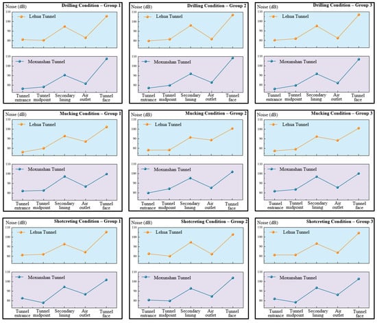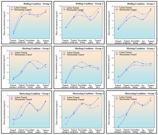 In this study, all tunnel microenvironment data were obtained through systematic on-site measurements to ensure the authenticity and representativeness of the data. Microenvironmental variables were obtained through discrete observations using portable devices to record key indicators—such as temperature, humidity, dust concentration, and noise levels—at different time points. Although the data were not collected continuously, this approach effectively captured the typical variations in the tunnel microenvironment during construction. Based on a systematic review of existing literature on tunnel engineering and environmental monitoring, this study selected drilling, mucking, and shotcreting as representative construction operations with significant environmental impact. Combined with key spatial nodes such as the tunnel entrance, tunnel midpoint, secondary lining, air outlet, and tunnel face, a multi-condition and multi-point microenvironment monitoring framework was established. Specifically, each tunnel is systematically tested under 15 different combinations of working conditions and measurement points, with three independent measurements in each group, and the average value is taken as the final reference data. This process reduces chance errors and deviations caused by instrument fluctuations, and enhances the robustness and repeatability of the data. This study utilizes a multi-dimensional and standardized sampling design, enabling the capture of the spatial–temporal variability characteristics of the tunnel microenvironment. This provides a solid data foundation for subsequent correlation analysis and mechanism exploration.