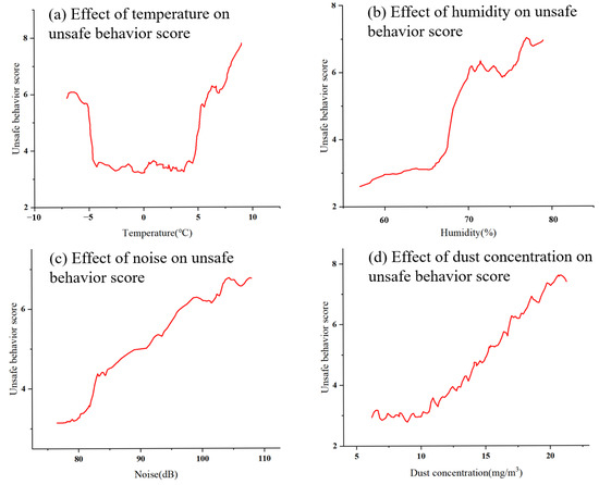 As shown in Figure 7 (d), as the dust concentration increased from 5 mg/m3 to 20 mg/m3, the unsafe behavior score exhibited an almost linear increase, indicating a significant positive correlation between the two. Especially after the dust concentration exceeded 12 mg/m3, the rate of increase in the score accelerated significantly. This finding suggests that high-concentration dust environments may increase the risk of unsafe behaviors among construction workers through pathways that affect respiratory health, occlusion of vision, and discomfort at work. It is recommended to control the dust concentration in the work environment to below 10–12 mg/m3 to reduce the occurrence of unsafe behavior.
