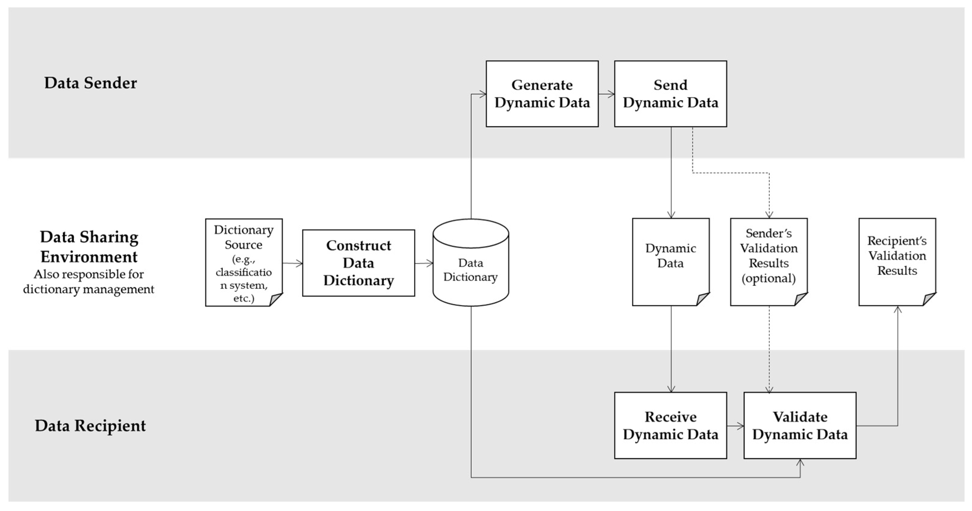 - Data Reception and Context Verification:The receiving system first ingests the data package, which includes dynamic JSON objects and the accompanying metadata. A critical initial action involves parsing the metadata to identify the specified data dictionary version(s) referenced by the sender. The system must ensure that it has the correct version of the dictionary, as this provides the essential semantic framework for all subsequent interpretation and validation tasks.